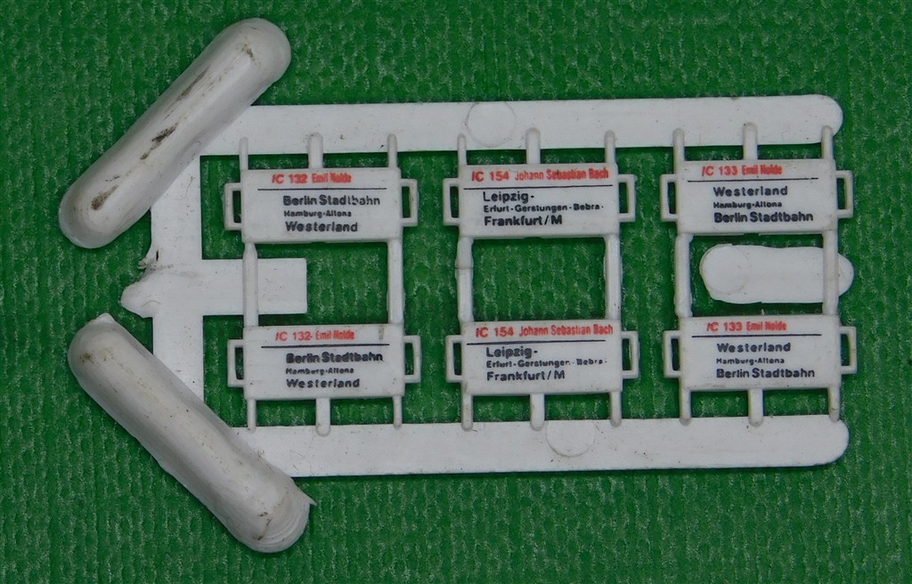 A sprue of H0 scale coach destination boards, make unknown but probably Roco,