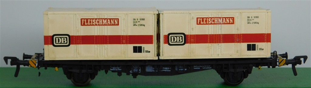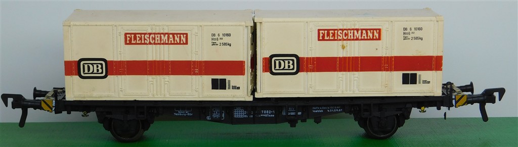 A Fleischmann German container wagon with Fleischmann containers, warped wagon body, pivoted Fleischmann couplings, no original box