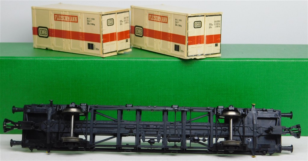 A Fleischmann German container wagon with Fleischmann containers, warped wagon body, NEM pocket couplings with close coupling mechanisms, , no original box