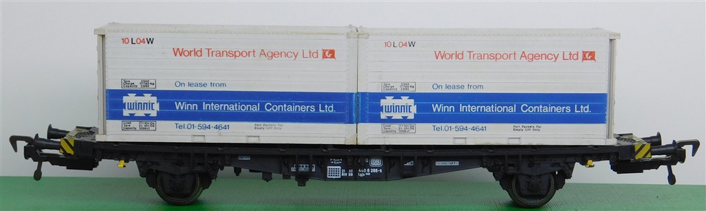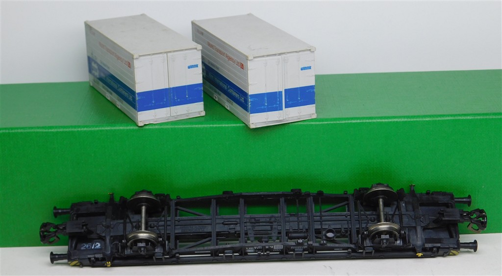 A Fleischmann German container wagon with Winn International containers, warped wagon body, NEM pocket couplings with close coupling mechanisms, , no original box