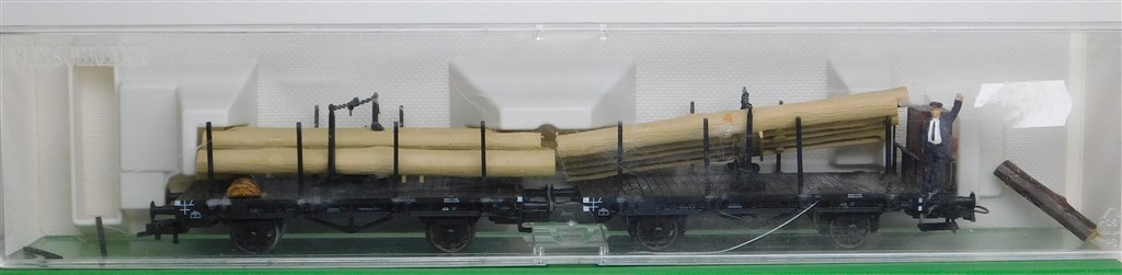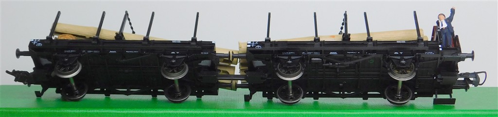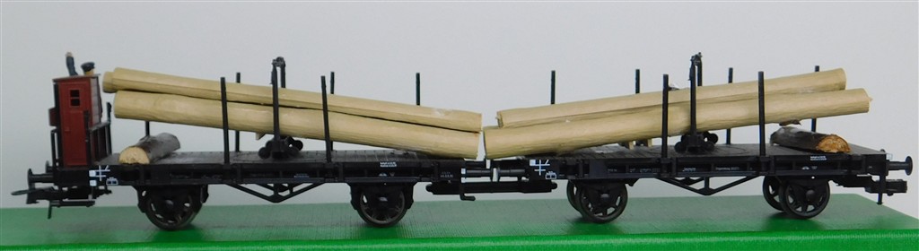 European H0 wagons: Pair Fleischmann single bolster wagons with log load, added wooden supports, missing two stakes