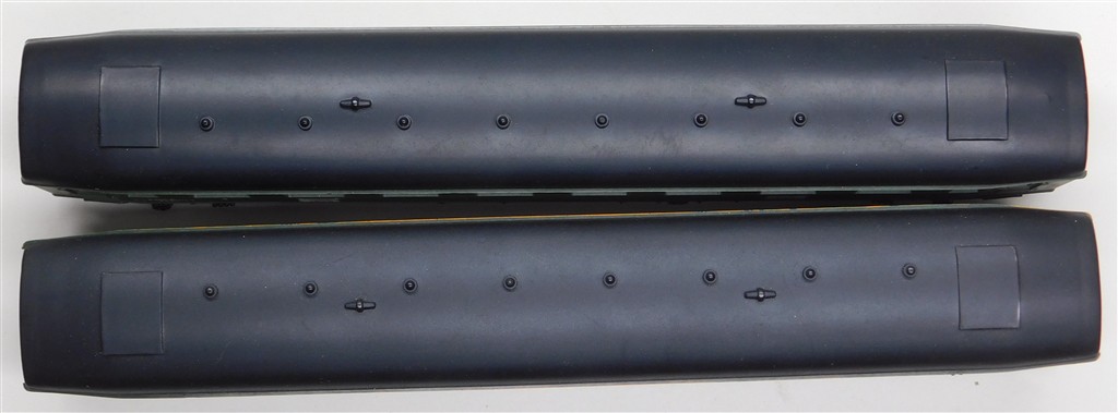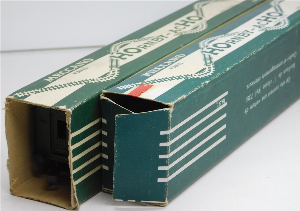 2 Hornby Acho French SNCF 1st class Paris-Lille coaches type A10myfi number 20045, with Hornby Dublo type couplings, in good condition, supplied in the tatty original boxes missing end flaps, one has a yellow stripe along the cantrail line, one does not