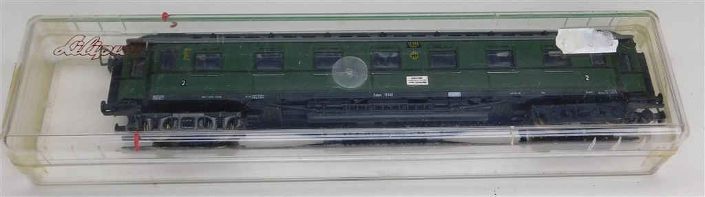 A Liliput German DRG Prussian 2nd class clerestory coach number 13566, with metal wheels and bogie mounted couplings, missing one coupling spring otherwise in good condition, supplied in an incorrect original box