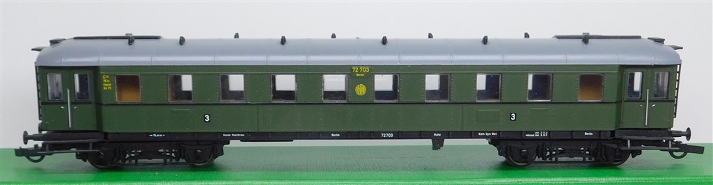 European H0 Coaches: Liliput 286 02 German DRG 3rd class steel bodied coach number 72703, missing corridor connections