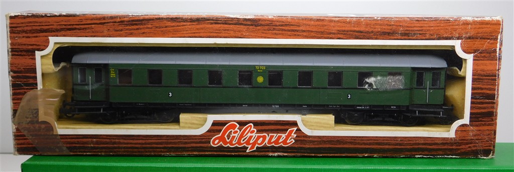 A Liliput 286 02 German DRG 3rd class steel bodied coach number 72703, with metal wheels and bogie mounted couplings in NEM pockets, missing corridor connections otherwise in good condition, supplied in the original box with a number 273 sticker on the end