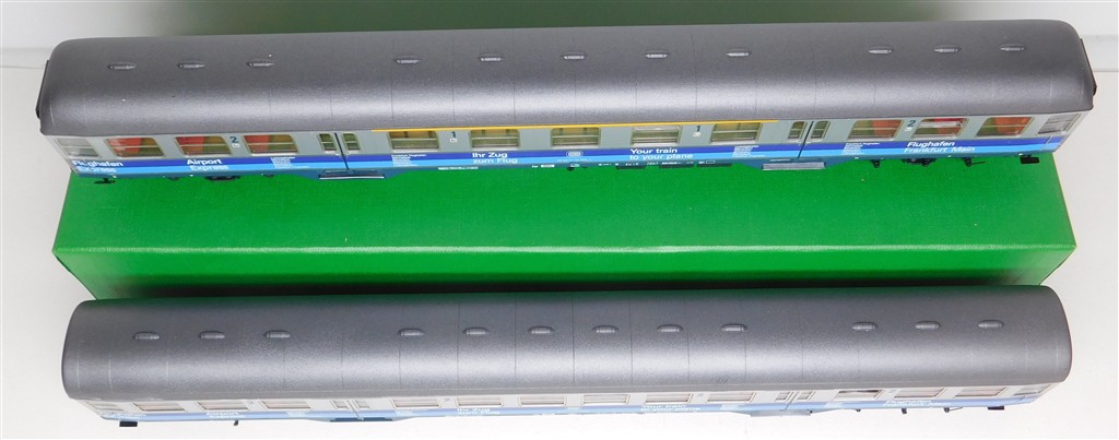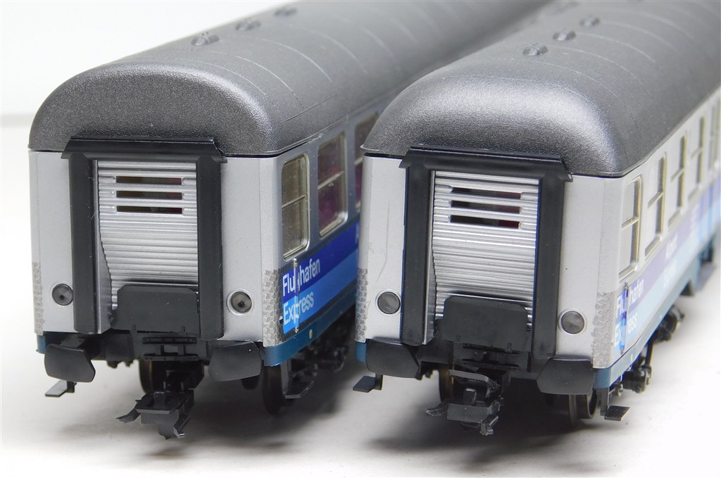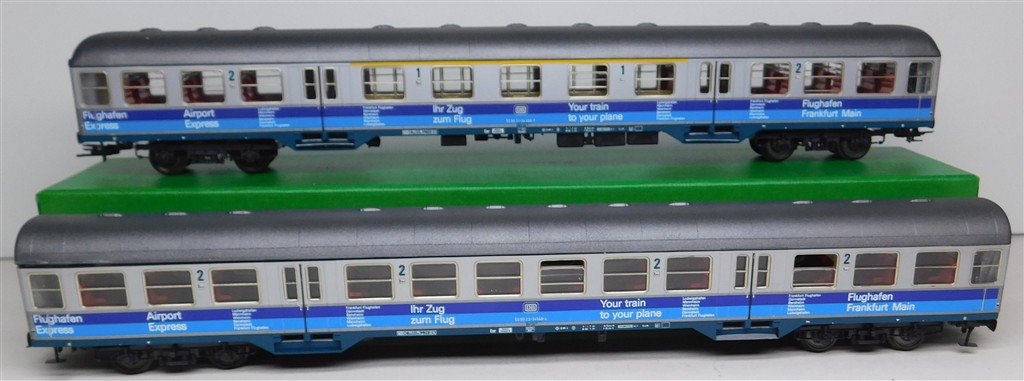 European H0 Coaches: Pair Ade scale length German DB Silverfish coaches with Flughafen Frankfurt am Main advertising