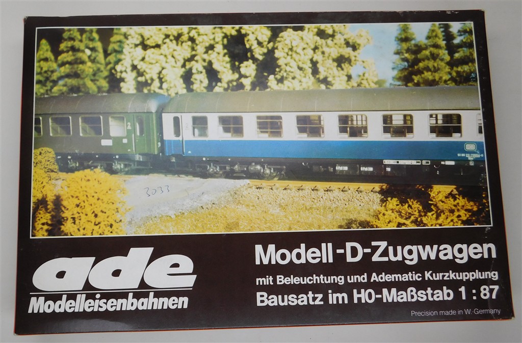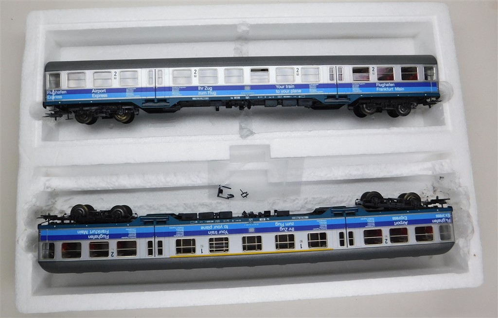 A pair of Ade scale length well detailed high quality German DB Silverfish coaches with Flughafen Frankfurt am Main advertising, in good clean condition, supplied in an incorrect original box. These coaches were made in the early 1970s and feature Willy Ade's own design close coupling mechanisms and coupling pockets which inspired the later NEM 362 standard but which are different, so couplings will need to be adapted to work with other stock.