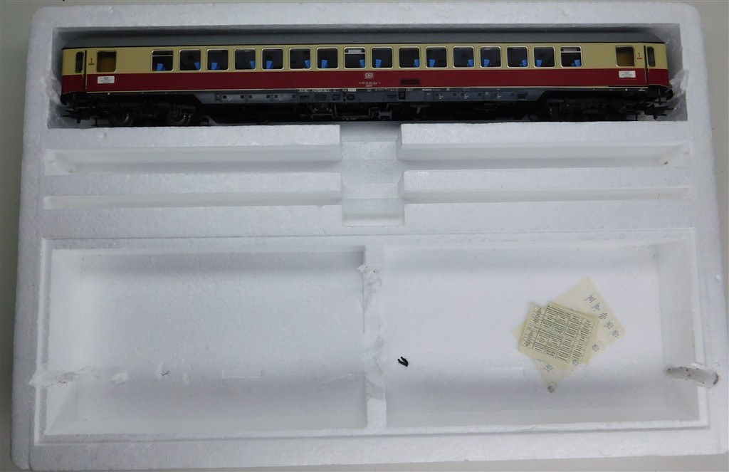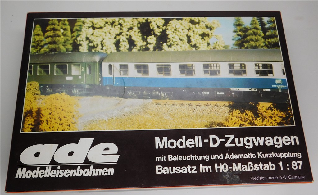 An Ade scale length well detailed high quality German DB InterCity Grossraum coach type Agümh number 61 80-18 80-004-4, in good clean condition, supplied in an incorrect original box. These coaches were made in the early 1970s and feature Willy Ade's own design close coupling mechanisms and coupling pockets which inspired the later NEM 362 standard but which are different, so couplings will need to be adapted to work with other stock.