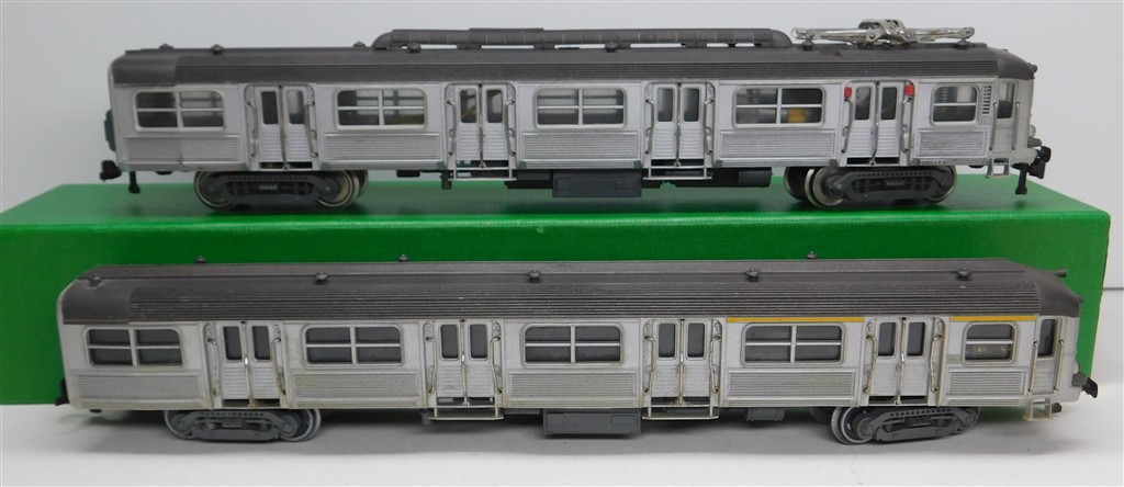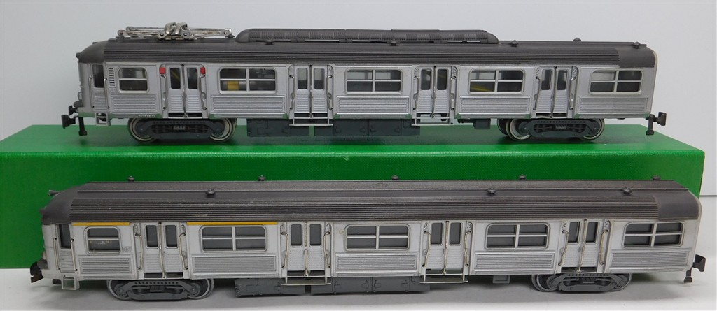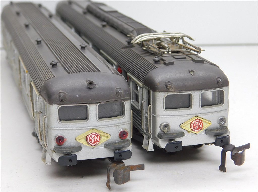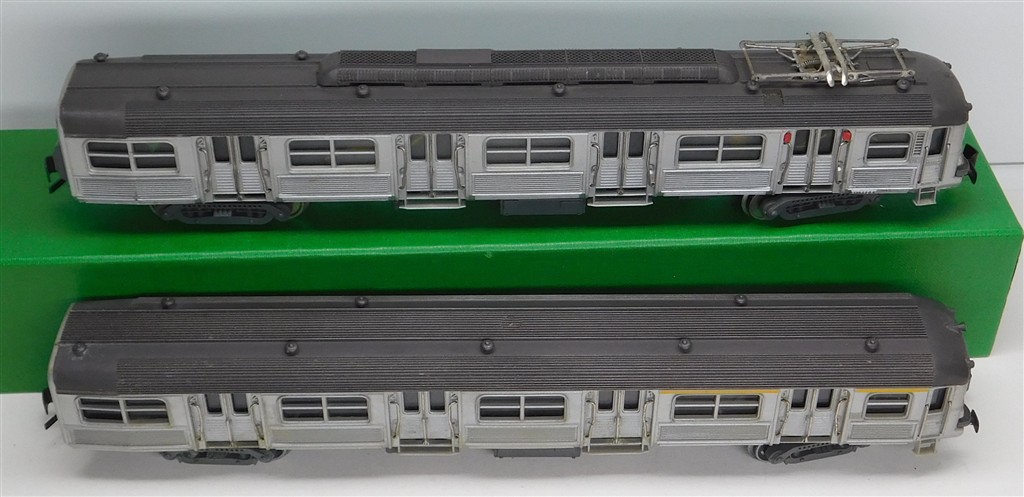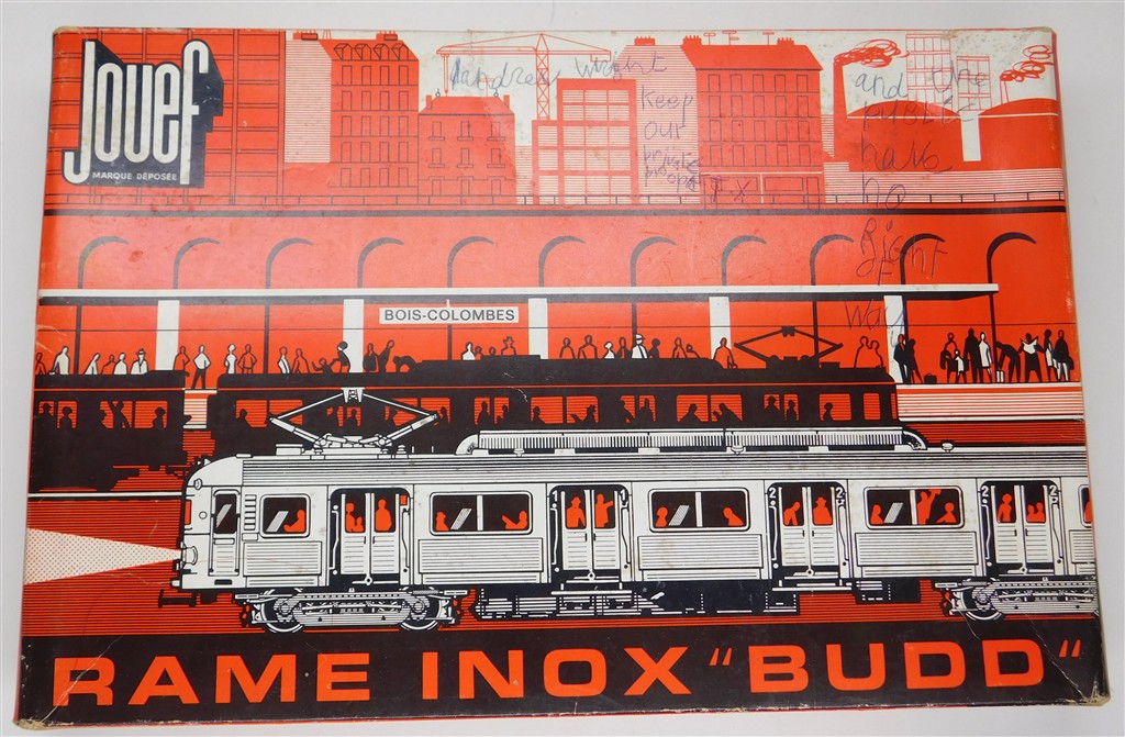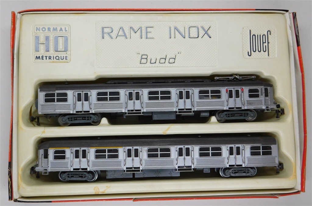 A Jouef M761E 2 car Budd EMU, reluctant runner that needs the pickup bogie given a thorough electrical clean and lubrication plus adjustments to the pickups to improve reliability, motor would benefit from lubrication but runs well if noisily when power applied directly, in good used condition, supplied in the tatty original box