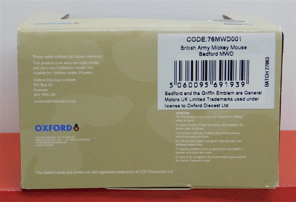 An Oxford 76MWD001 British Army Mickey Mouse Bedford MWD, in very good condition and supplied in the original box with sleeve.