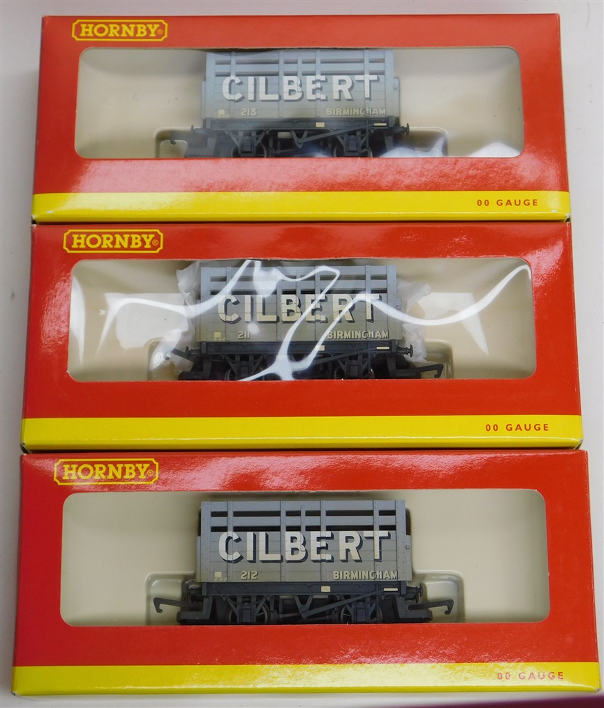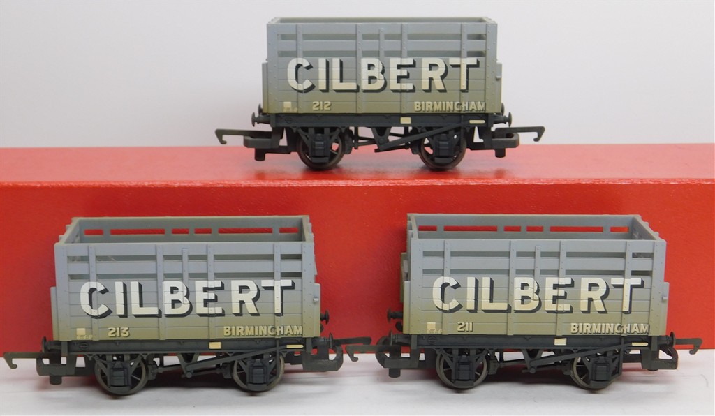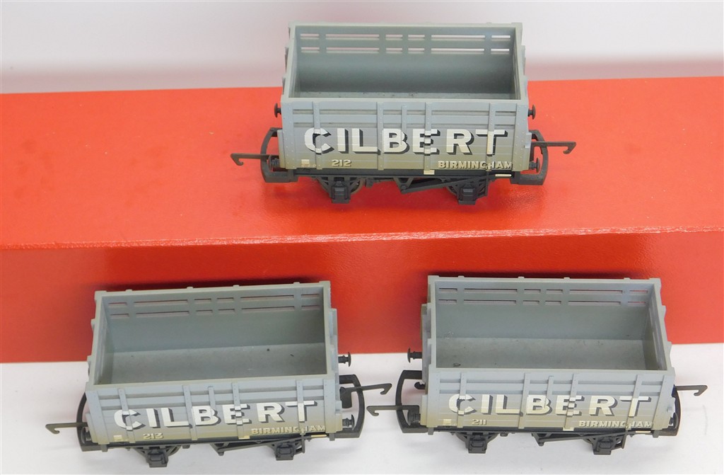 A Hornby R6151 Trio of Gilbert of Birmingham coke wagons numbers 211, 212 and 213, in good condition, weathered, supplied in the original box