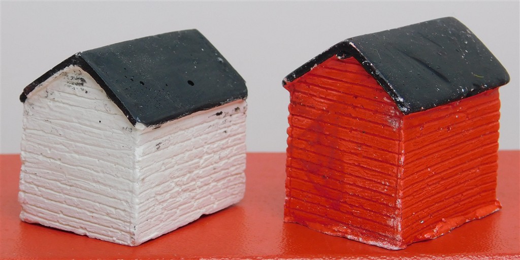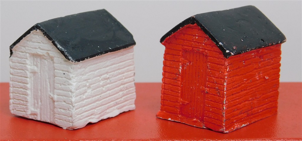2 00 scale garden sheds, suspect plaster castings, 2 small chips to the roofs, needs repainting