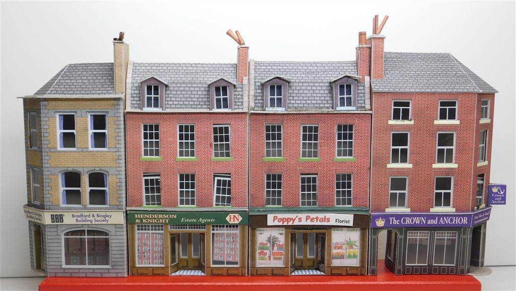 4 assembled Metcalfe low relief 3 storey shops, reasonably well assembled but sadly the edges haven been finished, chimneys need attention