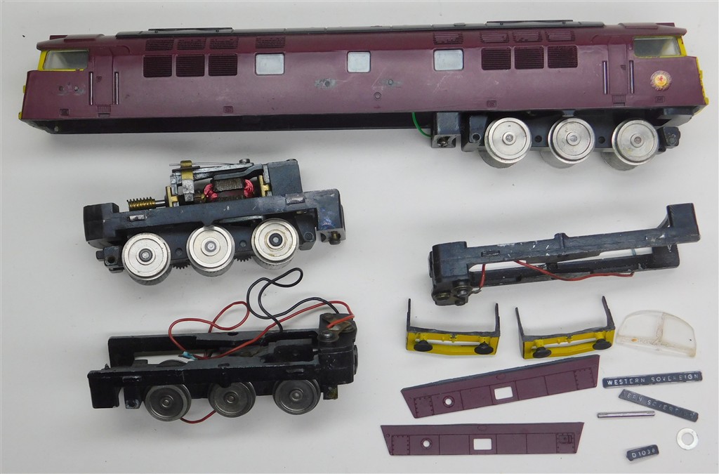 A Trix Western, missing some name and numberplates, in fair condition, motor is very reluctant when power applied, with a spare bogie, no wiring, please note this are 3.8mm/ft scale not 4mm/ft scale, no original box.
