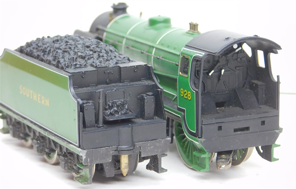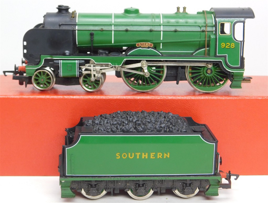 A Hornby tender drive Southern Railway Schools class 4-4-0 steam loco number 928 Stowe, good runner, apart from a missing part of the cab handrail in good condition, no original box.