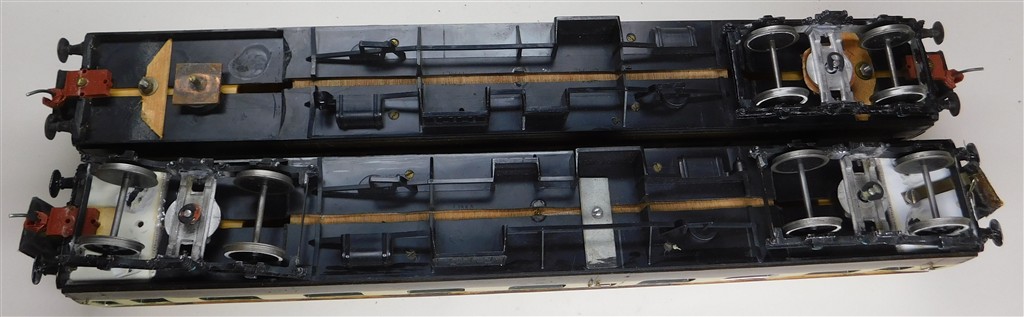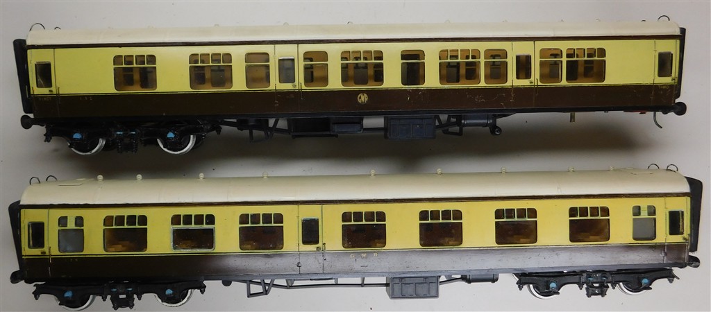 An interesting pair of homemade 0 gauge GWR coaches adapted from Lima coaches, missing one bogie, an interesting restoration project