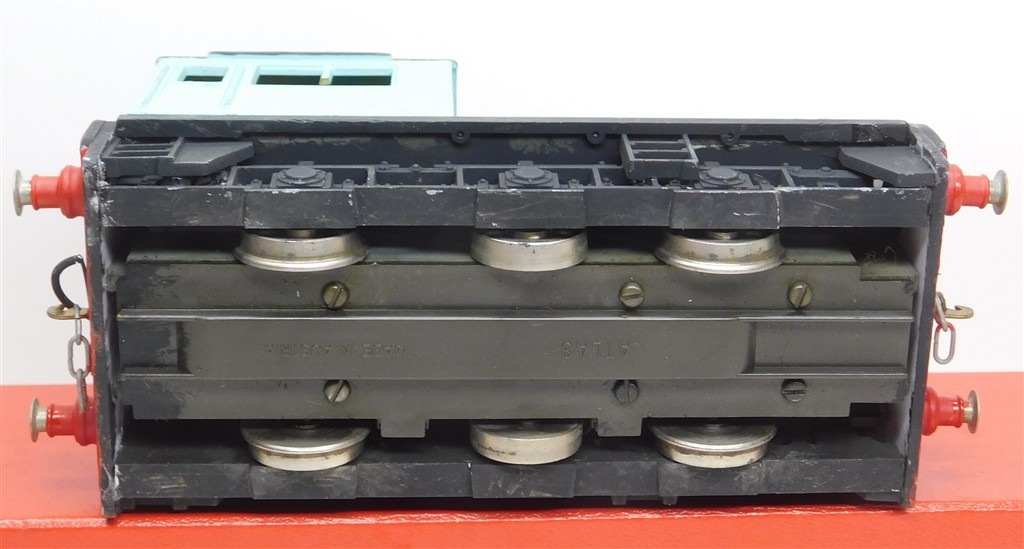 An Atlas by Roco blue repainted 0 scale Plymouth 0-6-0 diesel, reluctant runner: needs a thorough electrical clean and lubrication, headlight doesn't work, fine scale wheels, added buffers and 3 link couplings, no original packaging