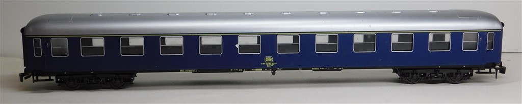 A Rivarossi 0 gauge 7781 German DB bogie 1st class coach, scale length, no interior fitted, in good condition, supplied in the original box. Note these will need to be sent ParcelForce rather than Royal Mail due to their length, 59cm long over buffers, box is 66cm long.