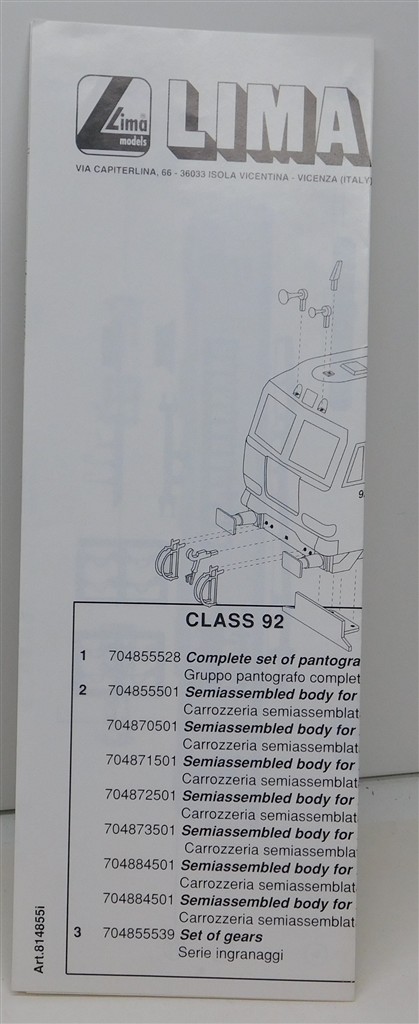 A Lima L204870 Class 92 Overhead Electric Locomotive Tunnel Livery - 92022 Charles Dickens, good runner, in very good condition, supplied in the original box with detail sprues, loose headlight cover needs refitting