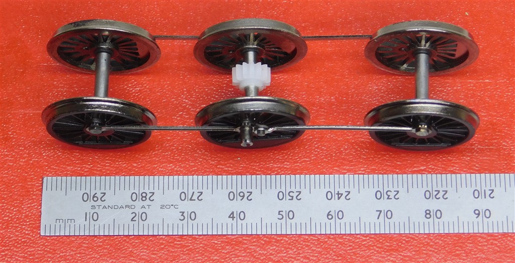 A set of Bachmann 21mm diameter driving wheels with con-rods, wheel spacing 36mm + 30mm