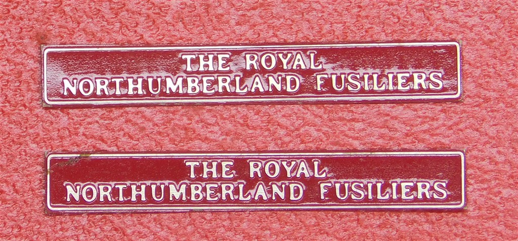 A pair of Bachmann Deltic "The Royal Northumberland Fusiliers" nameplates, removed from the etching frame