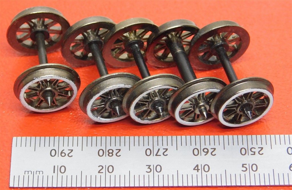 5 Bachmann split spoke 12mm diameter wheels, rims painted white in good used condition, needs a clean