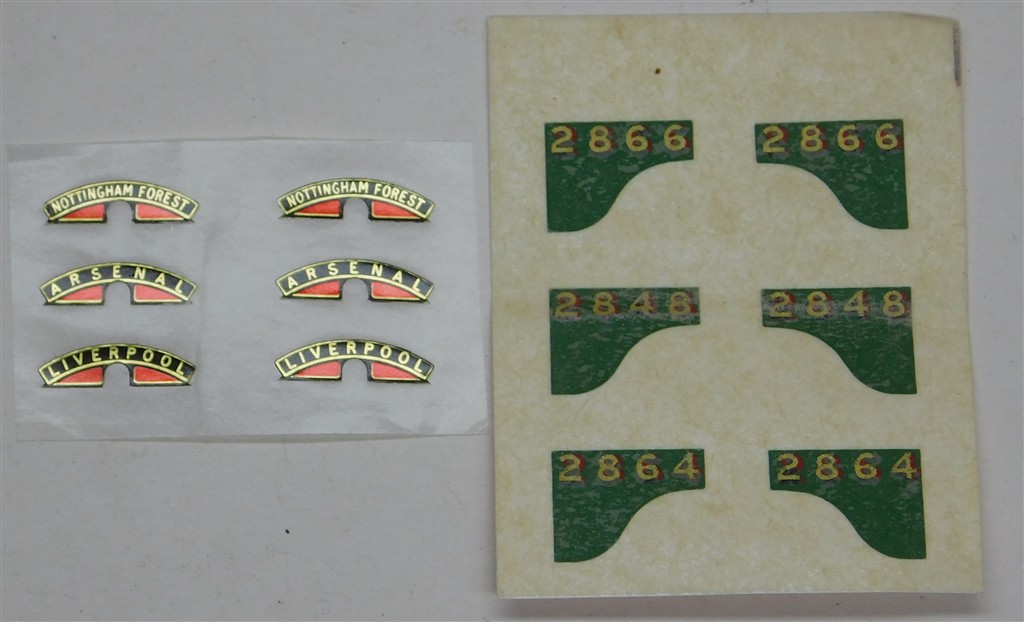 An unused set of Hornby LNER B17 self-adhesive nameplates Liverpool, Arsenal and Nottingham Forest