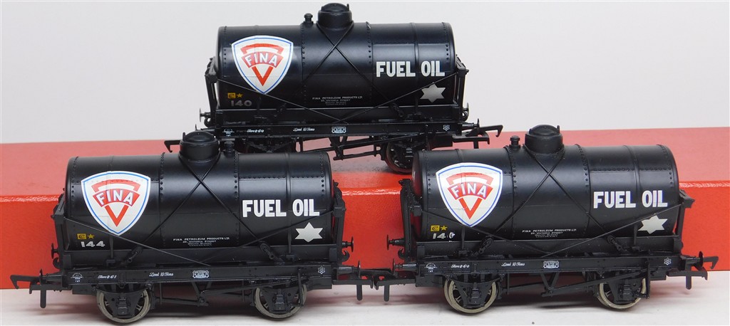 00 Wagons: 3 Bachmann Fina silver tank wagons number 140, 141 (crudely renumbered) and 144