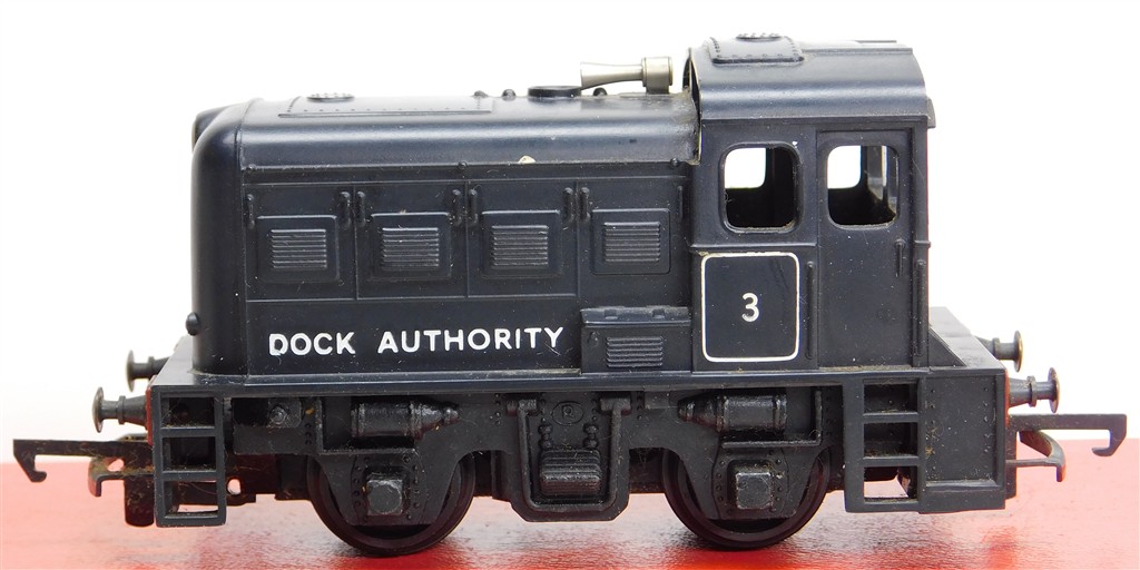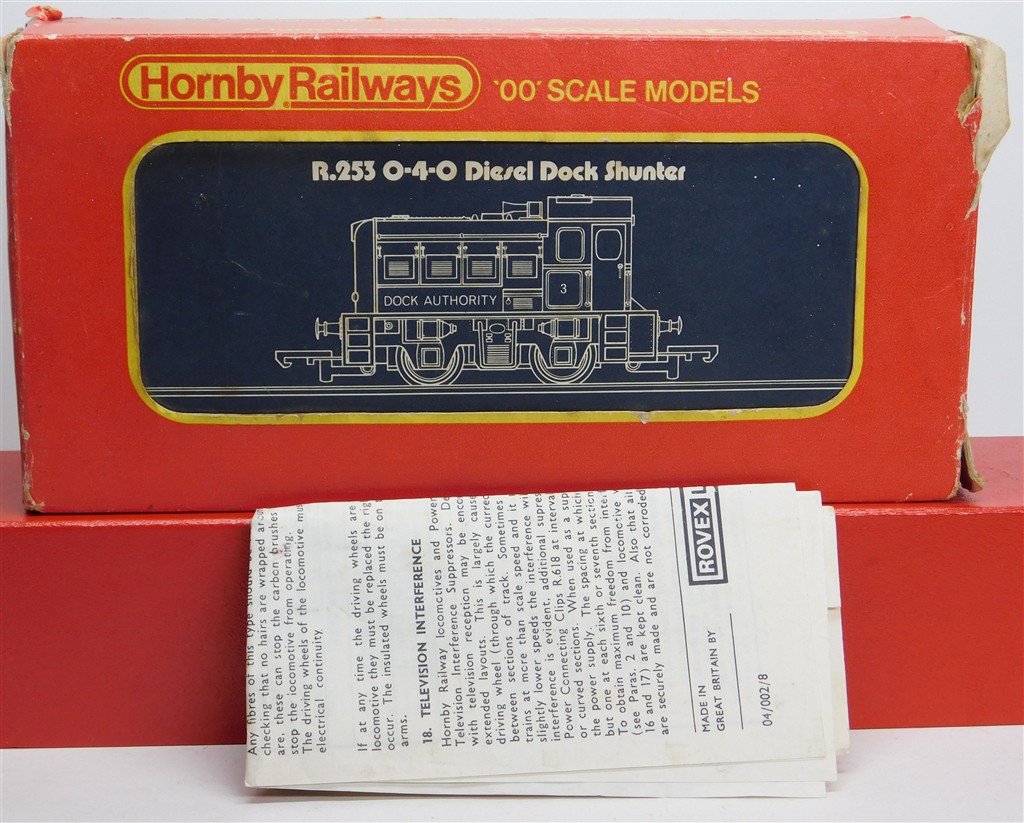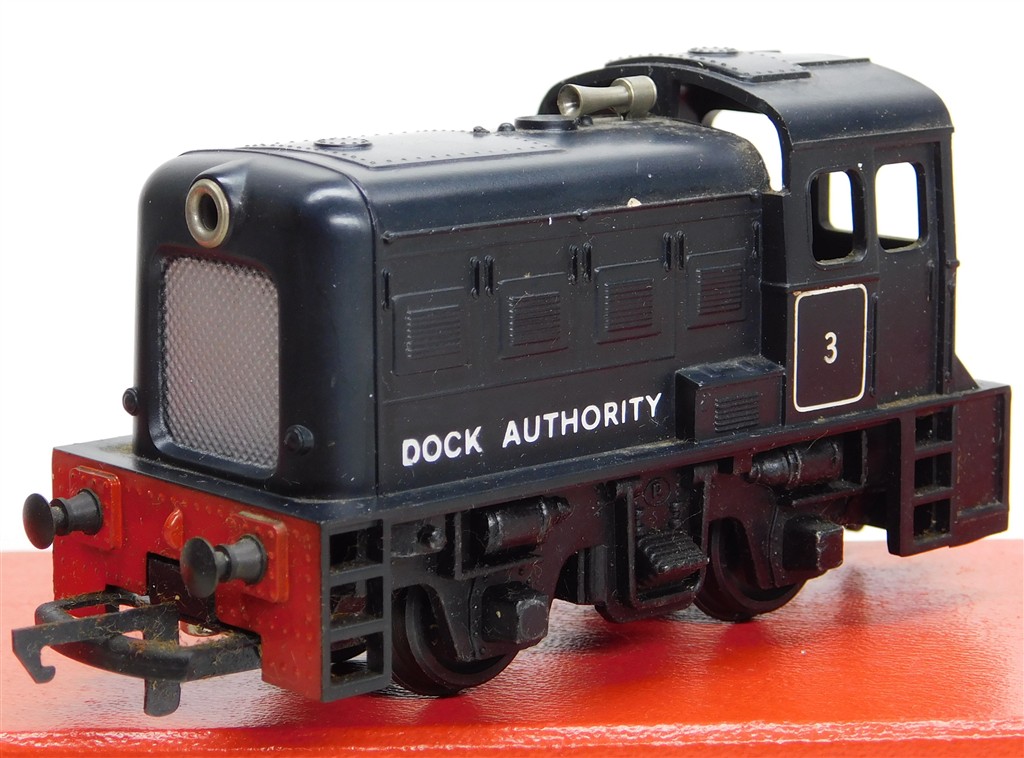 A mid 1970s production Hornby R253 black diesel dock shunter number 3, good runner with working non-directional headlight, in good condition, supplied in the tatty original box. Please note this loco needs a controller capable of delivering at least 600mA to run well, and doesn't like new Hornby or Peco points due to thick flanged wheels.