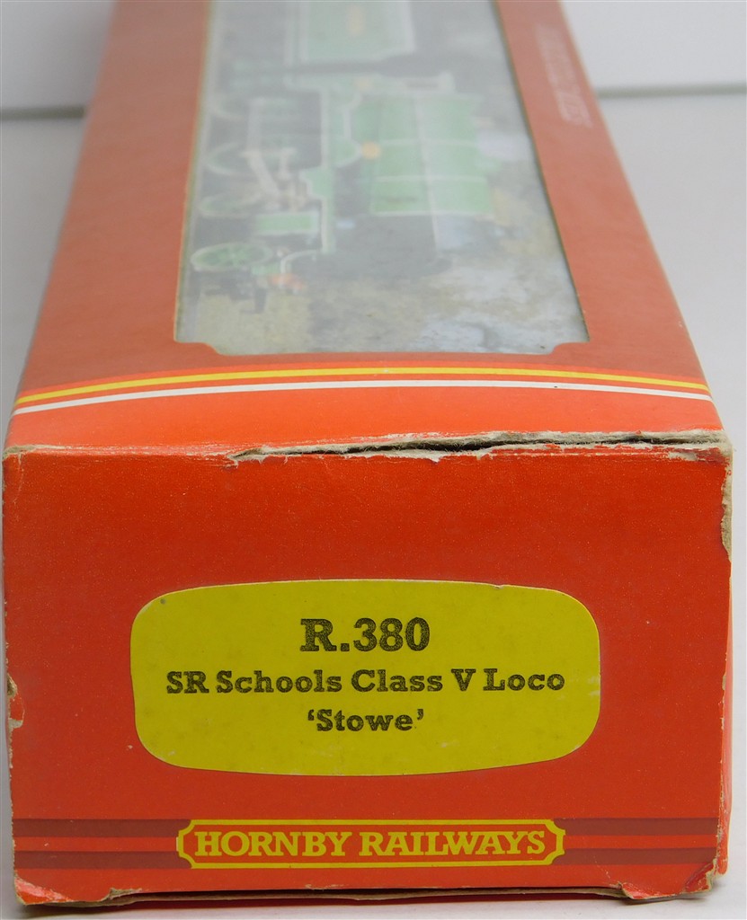 A Hornby R380 tender drive Southern malachite green Schools class steam loco number 928 Stowe, good runner, some discolouration on the tender chassis otherwise in good condition, supplied in the original box.