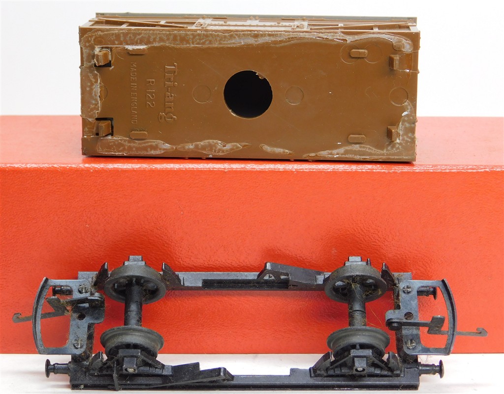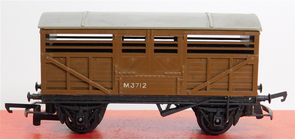 A Tri-ang dung brown cattle wagon M3712, unusual colour, Mark III couplings and metal chassis with deep flanged wheels, open axle boxes, loose body, in good condition but needs a clean, no original box.