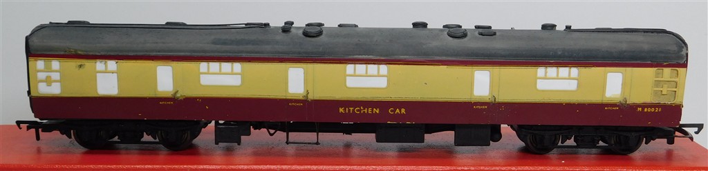 A heavily adapted Mainline with plastic sides BR kitchen car M80021, needs a clean, a tidy-up and possibly a roof repaint, no original packaging