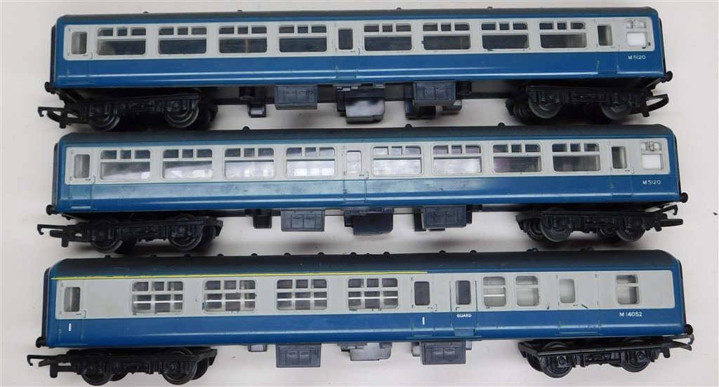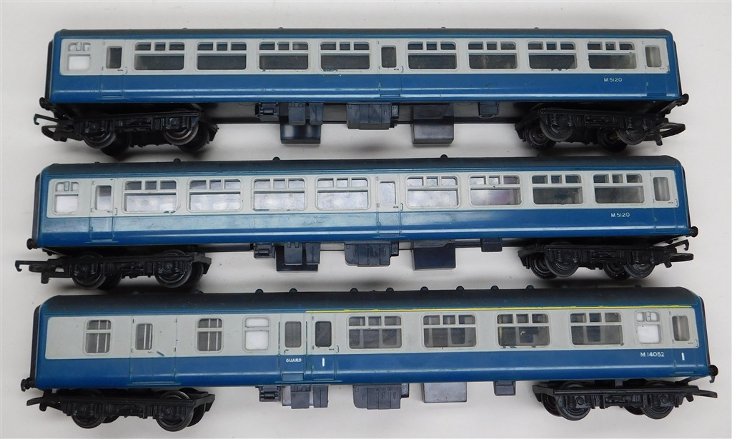 3 Hornby 1970s production blue and grey Mk2 coaches, 2 with primitive working lights, one with non-working primitive lights, in good used condition, bogie mounted couplings, no original boxes
