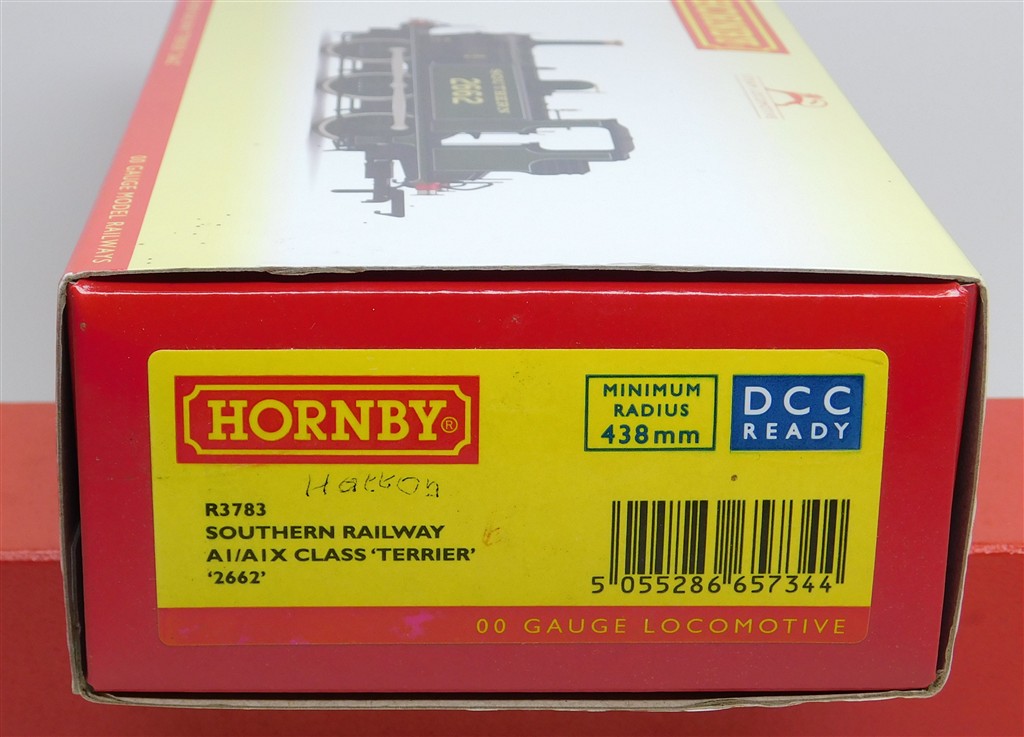 A Hornby R3783 Southern Terrier 2662, pickups need adjustment as they don't make proper contact with the wheels so it is a reluctant runner, needs an electrical clean too, apart from a glue spot on the front in good condition, supplied in the original box, sold as a project