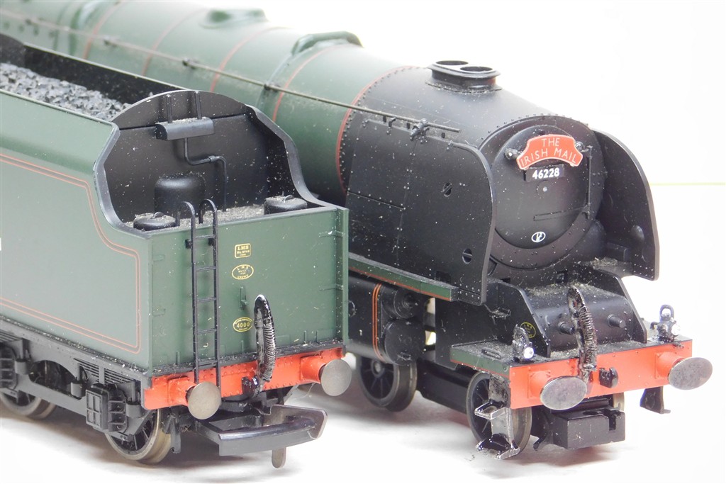 A Hornby loco drive BR Duchess of Rutland steam loco number 46228 with added front end details and Irish Mail train headboard, good runner, in good condition, needs a good clean, supplied in the original box.