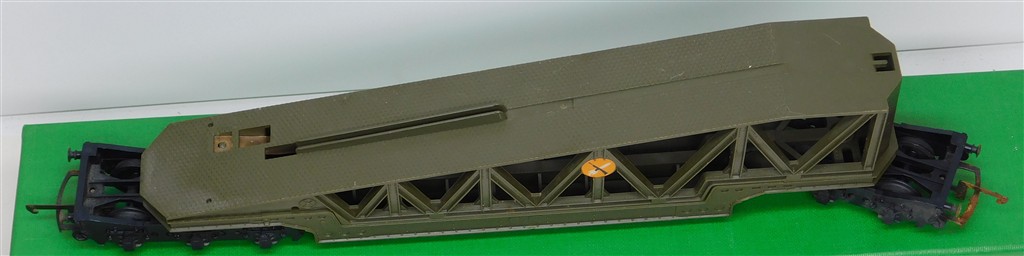 A Tri-ang Battlespace glider launching car, khaki, unnumbered, no glider, missing one wheelset, in fair condition but would benefit from a further clean, no original box