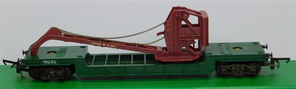 A Tri-ang TC TR green crane car TR2312, metal bogies with deep flanged wheels, missing crane hook and jib support bolster, slightly rusty couplings and axles, in fair condition but would benefit from a further clean, no original box, oddly fitted with buffers
