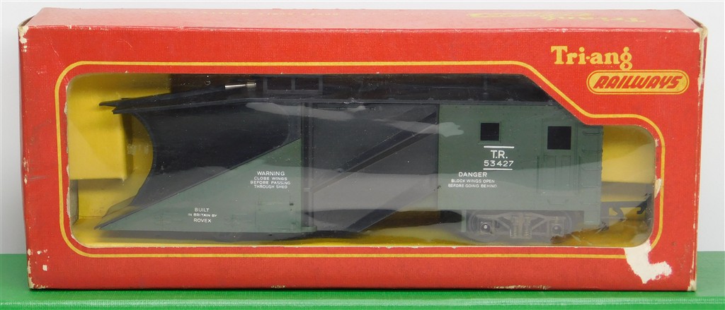 A Tri-ang R138 TC Russell Snowplow, green, metal bogies with deep flanged wheels, in good condition with opening side wings but would benefit from a further clean, supplied in the original window box