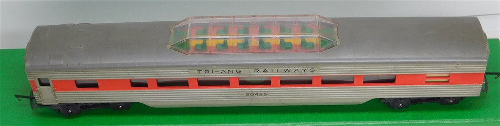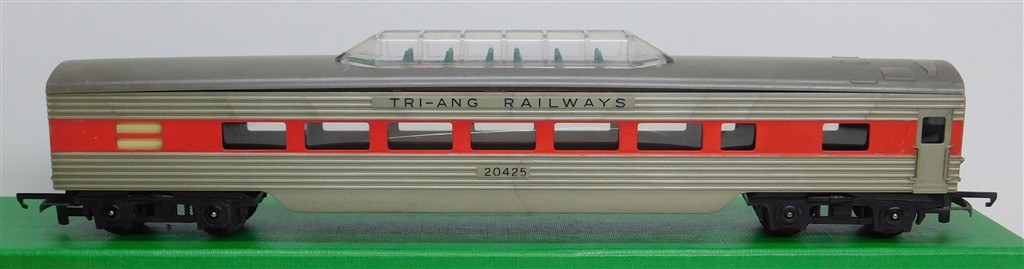 Tri-ang Transcontinental: Tri-ang TC TR 1st series silver and red observation car 20425 with plastic bogies, slightly bowed roof