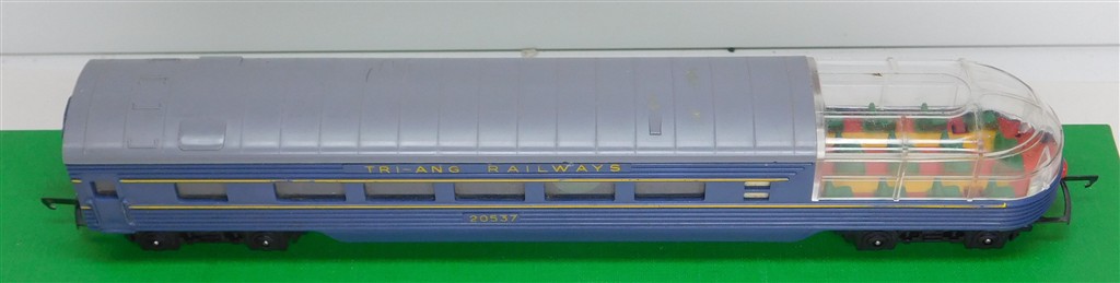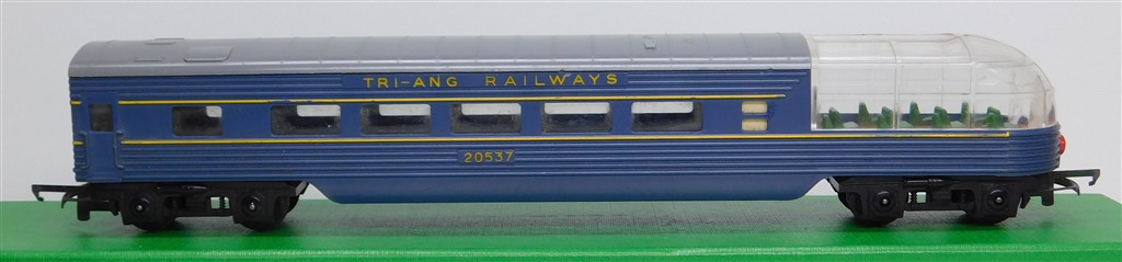A Tri-ang TC TR 1st series blue beavertail observation car 20537 with plastic bogies with deep flanged wheels, grey roof, rust spots on the couplings otherwise in fair condition but would benefit from a further clean, no original box