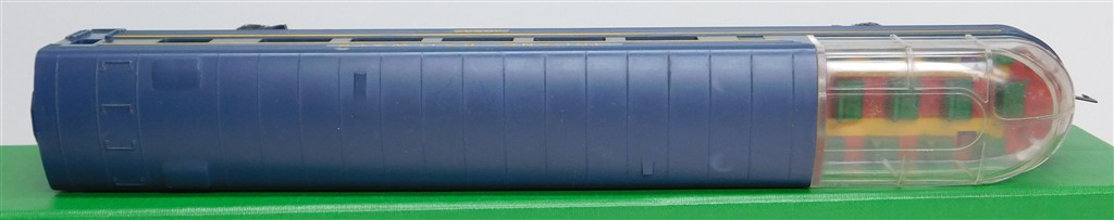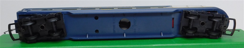 Tri-ang Transcontinental: Tri-ang TC TR 1st series blue beavertail observation car 20537 with plastic bogies, blue roof
