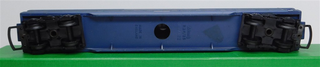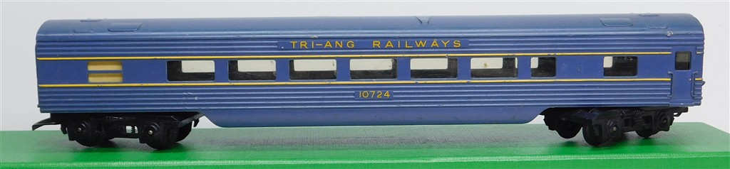 A Tri-ang TC TR 1st series blue passenger car 10724 with plastic bogies with deep flanged wheels, blue roof, missing coupling hooks, rust spots on the couplings otherwise in fair condition but would benefit from a further clean, no original box