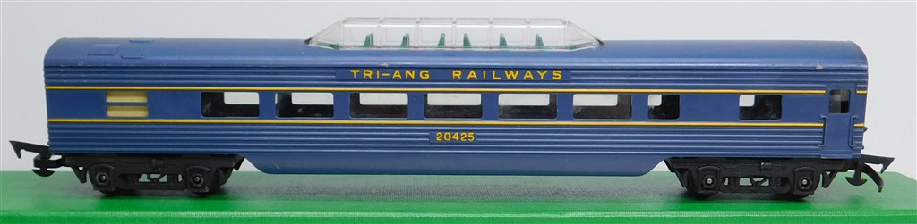 A Tri-ang TC TR 1st series blue observation car 20425 with metal bogies with deep flanged wheels and MkII couplings, blue roof, rust spots on the couplings otherwise in good condition but would benefit from a further clean, no original box