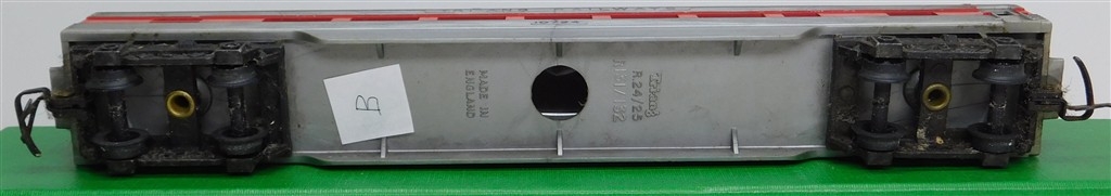 A Tri-ang TC TR 1st series silver and red passenger car 10724 with metal bogies with deep flanged wheels and MkII couplings, rust spots on the couplings otherwise in fair condition but would benefit from a further clean, no original box (B)