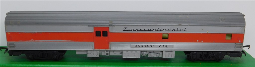 A Tri-ang TC Transcontinental 2nd series silver and red baggage car, considerable red paint loss, marks on the roof and rust spots on the couplings otherwise in fair condition but would benefit from a further clean, no original box