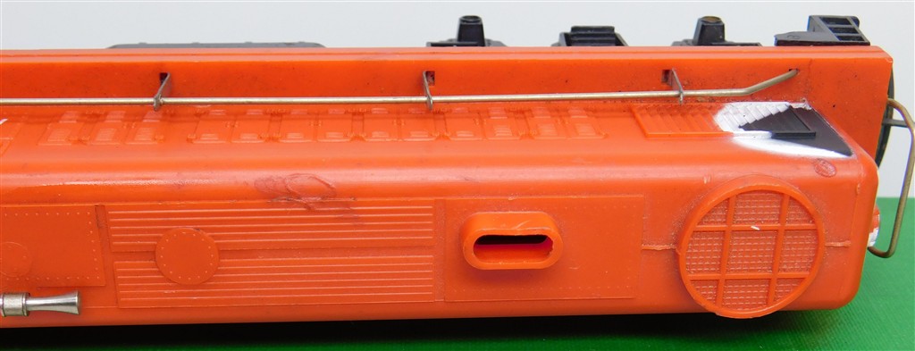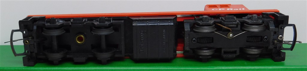 A Hornby Canadian CPRail red diesel switcher loco 1553, good if noisy runner, lights, re-wired, with both skirts and battery box, slightly rusty bent couplings, some minor heat distortion on the body, in fair condition but would benefit from a further clean, no original box. Please note this loco needs a controller capable of delivering at least 1A to run well, and doesn't like new Hornby or Peco points as it has deep thick flanged wheels.
