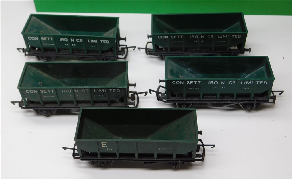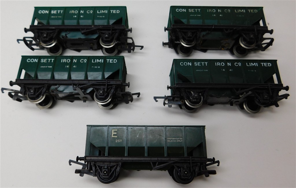 5 Tri-ang Hornby green hopper wagons with MkIII couplings, 4 Consett, 1 Engineering Dept, on metal chassis with deep flanged wheels so not suitable for Hornby/Peco track, open axle boxes, the engineering hopper is non-operating, some loose wheel rims, rusty operating mechanisms, one chipped corner, one missing coupling, in fair condition but needs a clean, no original boxes