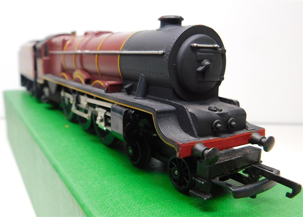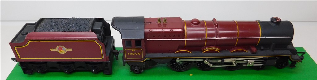 A 1960s production Tri-ang BR Maroon livery 4-6-2 steam loco 46200 Princess Royal with working smoke unit, good runner, some lining loss otherwise in good condition, no original box. Please note this loco needs a controller capable of delivering at least 600mA to run well, and doesn't like new Hornby or Peco points due to the deep flanged wheels