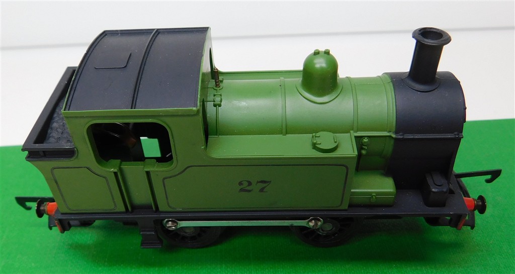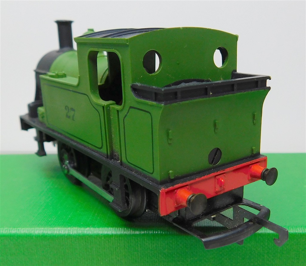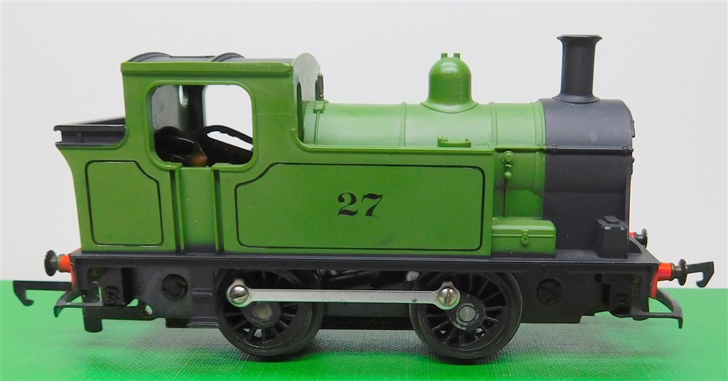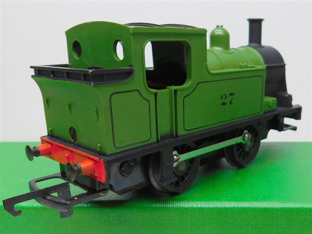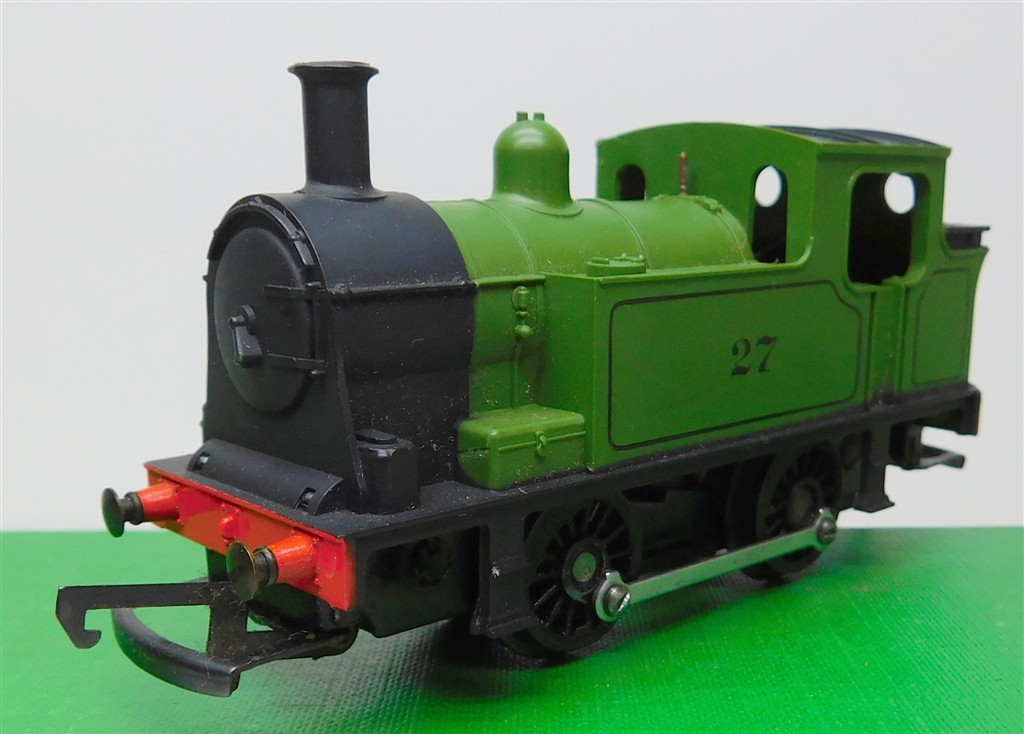 A late 1960s production Tri-ang Hornby green livery "Nellie" type 0-4-0T steam loco number27, good runner, missing one footstep otherwise in good condition, no original box. Please note this loco needs a controller capable of delivering at least 600mA to run well, and doesn't like new Hornby or Peco points due to the deep flanged wheels