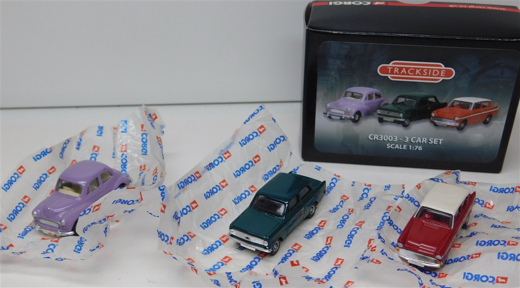 A Corgi Trackside three car set to include Morris Minor, Vauxhall Viva HA and Ford Anglia, all in very good condition and supplied in the original tissue and box.
